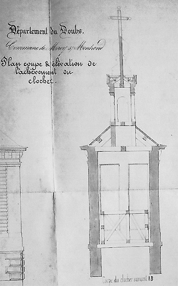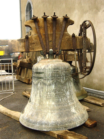 francs est votée. En 1867, Mr Painchaux, architecte, fait une visite au clocher. Quand il a vu le mauvais état du beffroi il a immédiatement interdit de sonner la grosse cloche. (L’histoire se répète!) Un crédit de 1429 francs est voté pour la reconstruction du beffroi, destiné à la suspension des cloches et le perron de l’église. |